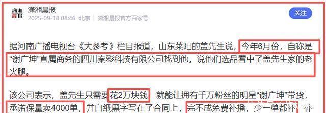 出于对“ 谢广坤” 这一国民IP的信任。 盖先生爽快支付𱄾万元坑位费。 可直播当天的情况, 却让他大跌眼镜。